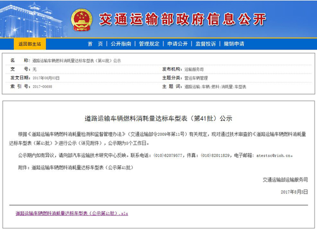 根據(jù)《道路運(yùn)輸車輛燃料消耗量檢測(cè)和監(jiān)督管理辦法》(交通運(yùn)輸部令2009年第11號(hào))有關(guān)規(guī)定,現(xiàn)對(duì)通過(guò)技術(shù)審查的《道路運(yùn)輸車輛燃料消耗量達(dá)標(biāo)車型表(第41批)》進(jìn)行公示(詳見(jiàn)附件),公示期為5個(gè)工作日。其中包括湖北同威汽車配件有限公司的5款車型,分別為HTW5040TQZPQ清障車,HTW5080TQZPJH清障車,HTW5110GJYEQ加油車,HTW5111GJYQ加油車,HTW5127GJYEQ加油車,具體公示內(nèi)容請(qǐng)看下表。